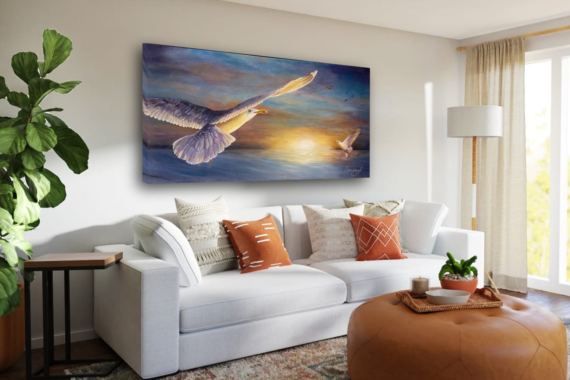 This can add a beautiful addition to your space. It’s a perfect size for above a couch, fireplace or nook area. Sunset Serenade in Flight’s dimensions are 48” x 24 “ with a 1 ½” gallery wrap, this allows you to display the artwork without the added bulk of a frame.