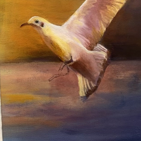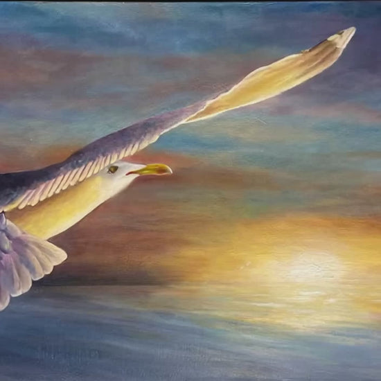 "Sunset Serenade in Flight" is an invitation to witness the balance and peace found in nature's fleeting moments. The thoughtful application of the golden ratio ensures the composition feels both dynamic and perfectly proportioned, offering a sense of spiritual serenity and wonderment. It's a testament to the endless inspiration nature provides and a celebration of the cosmic dance that unfurls every evening as day gracefully transitions into night. It also features a palette of metalllic paint of golds, coppers, purples and blues, a harmonious trio to balnce most home or business decor.